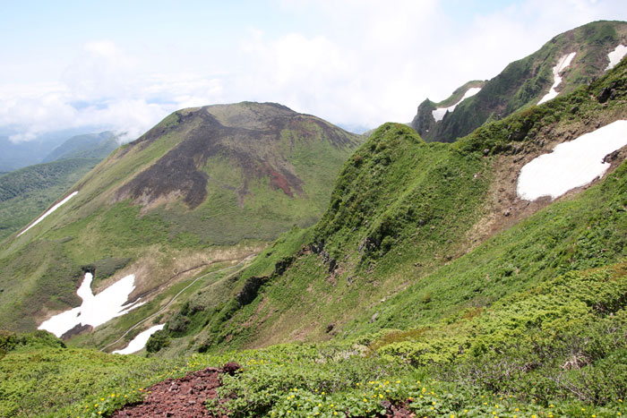 - ミヤマキンバイと活動を続ける火山・女岳(めだけ、1,512m)・・・噴火警戒レベル1。