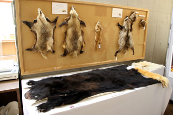 - 獲物は山の神様からの授かり物・・・その大切な神事が、阿仁ではケボカイ、只見をはじめ奥会津ではサカサッカワという。クマの皮を剥ぎ取ると、それを逆さにクマに着せ掛け、古猟師が獲物の頭の方に立って皮を三回煽りつつ、何やら呪文を唱えて慰霊を行った。名称は異なるが、どちらも腹を裂く前に、シカリがはぎ取った皮を持ち、その霊を山の神様のもとへ丁重に送る儀式は同じである。こうした儀式は、秋田マタギの影響を伺わせる。(写真:小国町「マタギの館」/2019年マタギシンポジウム・田口洋美)