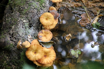 - アカチシオタケ・・・初夏から秋、ブナなど広葉樹の腐木、埋もれ木などから発生する。柄が赤く、傷をつけると、傘やヒダ、柄ともに橙色の液がにじみ出てきて、キノコを赤く染めるという。だから「赤血潮茸」という。