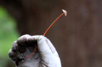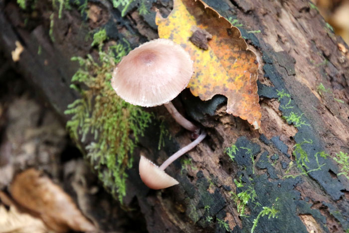 - チシオタケ・・・その名のとおり、傷つくと暗赤色の液が出る。表面は帯褐赤色で放射状の条線がある。柄は傘と同色。夏から秋、広葉樹の朽木に発生。