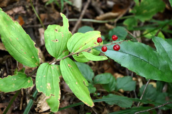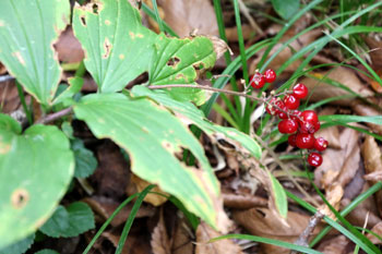 - ユキザサ・・・赤色の実は球形の液果で、ガラス玉のように光沢があるのが特徴。実は有毒。