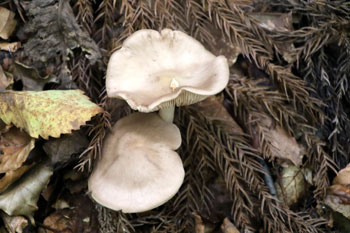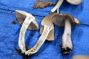 - クサウラベニタケ・・・食用のウラベニホテイシメジとよく似ていて、判別が難しく、「名人泣かせ」の異名があるほど有名な食中毒菌。コナラ、クヌギ、シイなどの雑木林によく発生する。成熟したキノコのヒダは肉食だが、若いうちは白色で、シメジ類と間違えやすい。傘表面は乾くと絹状の光沢がでるが、ウラベニホテイシメジのように細かいかすり模様はない。傘肉は薄く、もろい。粉臭がある。ヒダは初め白色のち淡い肉食。柄は中空でつまむとつぶれる。イッポンシメジ属はほとんどが有毒なので、手をださないこと。