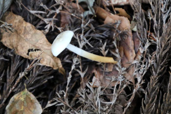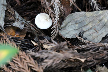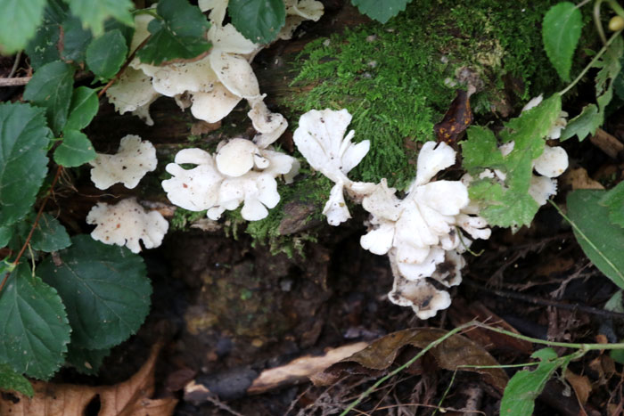 - スギエダタケ(食用)・・・スギの埋もれた落ち枝に発生する。表面は白色。キノコの少ない針葉樹林で貴重な食用キノコ。柄をとりバター炒めやオムレツに。