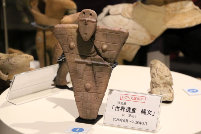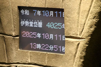 - 縄文館のエントランスには、高さ2mの巨大板状土偶のレプリカがある。その右下に掲示されている伊勢堂岱暦によれば、誕生から今日で「4025年」となっていた。