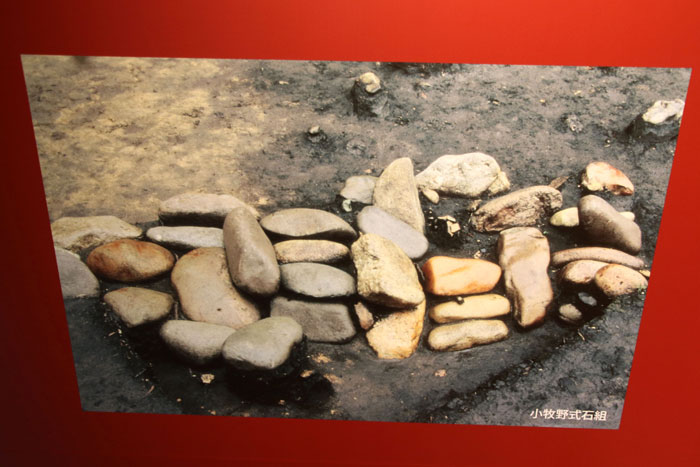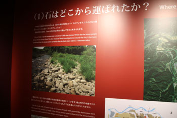 - 板状土偶・・・実物の板状土偶は、高さ19cm、肩幅16cm、厚さ1cm。エントランスのレプリカは実物の12倍でつくられている。環状列石の周りの土抗墓の中から、頭部と胴部が分かれて出土した。同遺跡では、200点近くの土偶が出土しているが、どれも破片で、完全な形に復元できたものは、この1点のみだという。