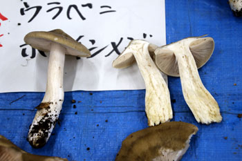 - 参考:食用のウラベニホテイシメジと毒キノコ・クサウラベニタケの見分け方・・・キノコを縦に割ると、食用は柄が充実している(上左)のに対して、毒キノコの柄は中空で(上右)つまむとつぶれる。キノコ採りの名人は、食用のウラベニと同定できても、軸が細く短いものは絶対にとらないという。