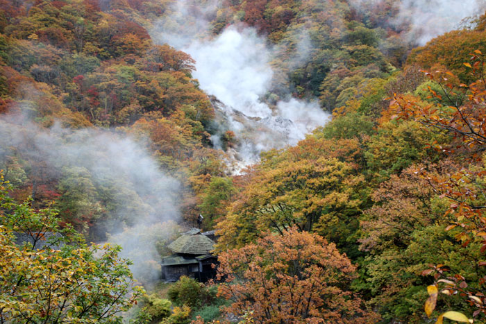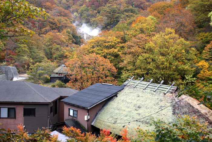 - 黒湯温泉と紅葉・・・乳頭温泉郷の最奥部先達川上流に位置する黒湯周辺は、ちょうど紅葉がピークを迎えていた。黒湯は、古くは秋田藩の湯治場で、鶴の湯温泉に次ぐ歴史がある。発見は1674年頃と推測されている。黒湯の主人は、大仙市「旧池田家庭園」で知られる池田家16代目当主である。