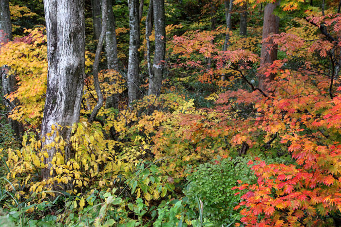 - 適度な湿度・・・適度な雨量が適度な間隔で続くこと。ブナ帯の渓谷は、この三条件がそろうので紅葉の名所が多い。