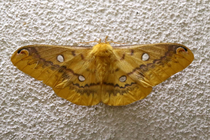- ウスタビガ(ヤママユガ科)・・・ブナ林が黄葉する頃に羽化する。だからハネは黄葉に同化した黄色で、半透明の目玉模様がある。写真の個体は、乳頭キャンプ場のトイレの壁に張り付いていた。
