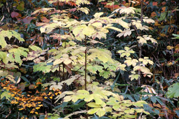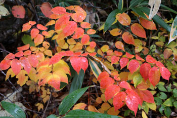 - 美しいハウチワカエデの紅葉・・・カエデの仲間では、葉が最も大きいから、一度に色づかず、葉先から少しづつ変化していく。黄緑、黄色、オレンジ、赤など変化に富み、多彩なグラデーションでブナ帯の森を艶やかに彩る。日当たりの良いところほど、美しく紅葉する。日陰で日射不足になると黄色いままのことが多い。