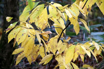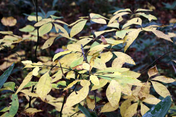 - コシアブラの黄葉・・・葉は5枚の小葉が掌状につく複葉。白っぽく半透明な黄色に黄葉する。名前は、昔、樹脂液を漉して金漆(ゴンゼツ)という塗料を作ったことに由来する。