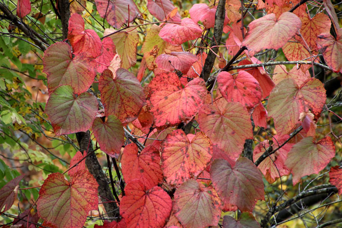 - ヤマブドウの紅葉・・・大きな葉は、黄色からオレンジ、赤、赤紫に色づいて美しい。