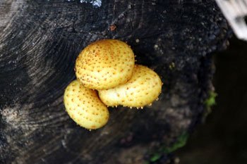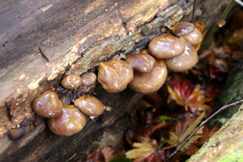 - ヌメリスギタケ/ムキタケ(食用)・・・ムキタケは、ブナやミズナラなどの立枯木や倒木に重なり合って群生する。このキノコが生えると、マイタケの発生は終わりと言われている。
