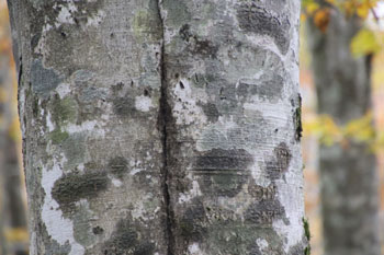 - 凍裂(とうれつ)・・・ブナの幹が縦に一直線に割れた線が入っている。これは幹が凍結して膨張し、弾けるように裂ける現象。これを凍裂と言い、摂氏零下25度以下で起こるという。