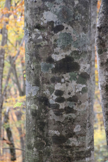 - ブナの樹皮・・・灰白色でなめらかな樹皮には、地衣類や苔の仲間などがつき、特有の斑紋(上左写真)がある。ところが、硫化水素を浴びる周辺のブナの幹では、特有の地衣類などが育たず、木肌が白っぽいブナ(上右写真)が林立している。