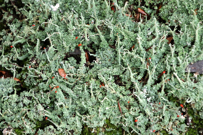 - イオウゴケ・・・硫化水素の臭いがする温泉噴気孔の周辺に分布。子器の部分が赤くなるのが特徴。子柄と呼ばれる立ち上がっている部分は粉芽というもので覆われている。苔の仲間ではなく地衣類である。