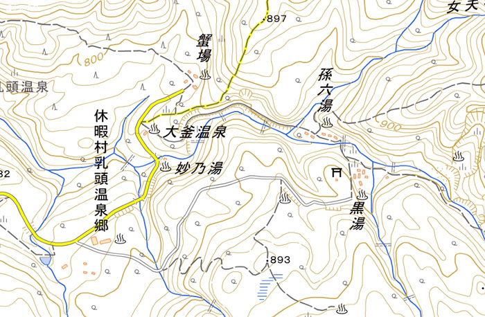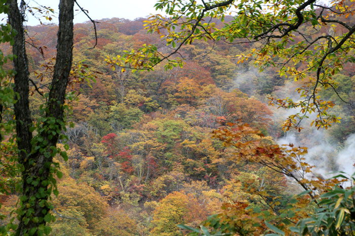 - コース・・・旧乳頭スキー場(標高770m)→休暇村乳頭温泉郷→空吹湿原(890m)→黒湯(830m)→孫六温泉→大釜温泉→妙の湯→休暇村乳頭温泉郷→旧乳頭スキー場(標高770m)