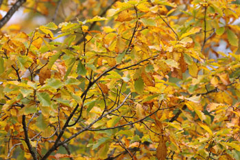 - ミズナラの黄葉・・・黄葉から褐色に変化。落葉するにつれて青空が透けて見えるようになるが、そのコントラストがまた美しい。