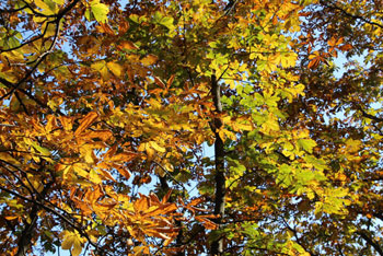 - 葉に蓄積した糖類が紫外線を浴びると、アントシアンやタンニン系の色素に変化する樹木は、それぞれ赤や茶に紅葉する。ハウチワカエデやモミジ、ナナカマド、ツタウルシ、ニシキギなどは赤く(紅葉)なり、ブナ(上の写真)やトチノキ、イチョウ、カツラなどは黄色(黄葉)になる。