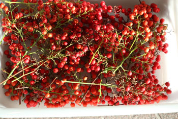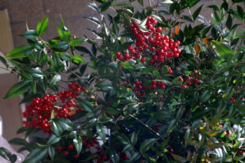 - ナンテン(南天)・・・「難を転じて福となす」縁起物。赤い実はめでたい。また火災避け、悪魔除けの効果があるとされている。またナンテンには防腐効果があり、この葉で魚や肉などの生ものを包むと効果的だともいわれている。