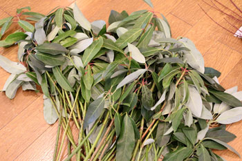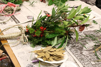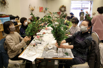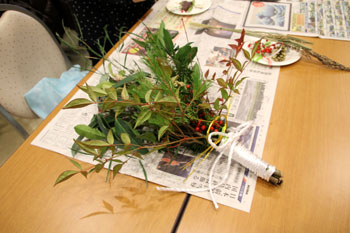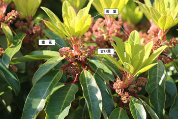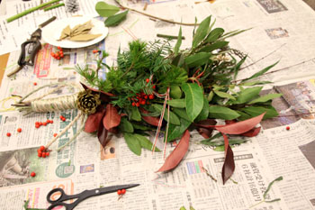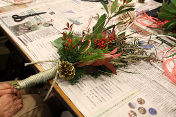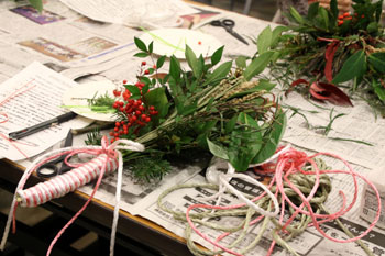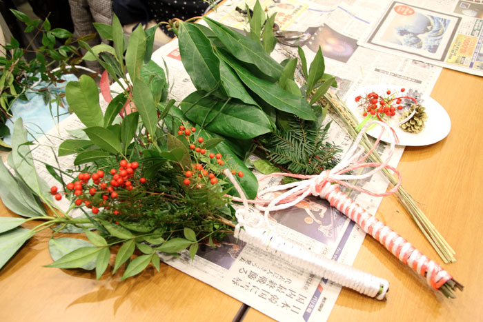 - カナメモチ・・・カナメモチの花言葉は「賑やか」で、材が硬くて「扇の要(かなめ)」に使われることから、正月に飾れば一家が一つにまとまり、賑やかな正月が迎えられると言われている。