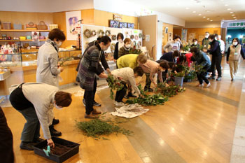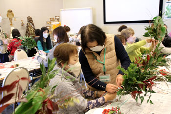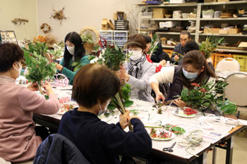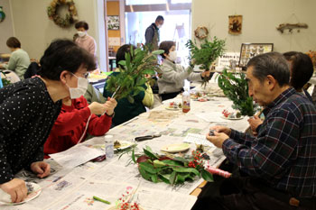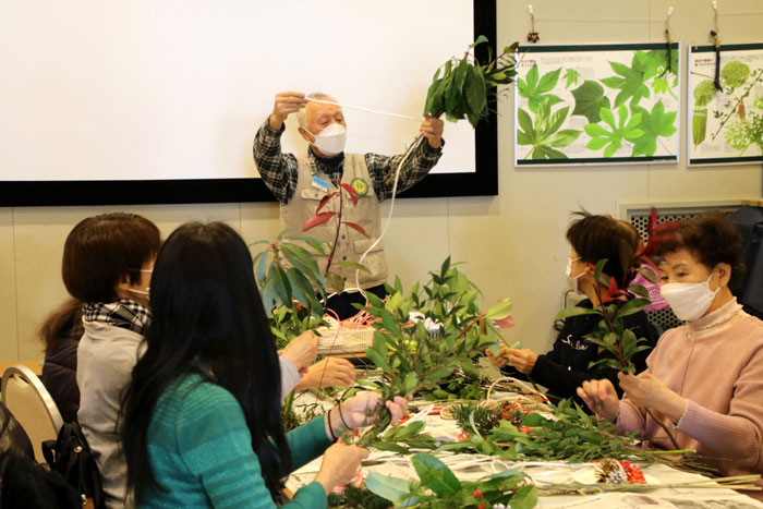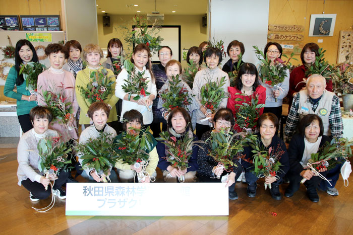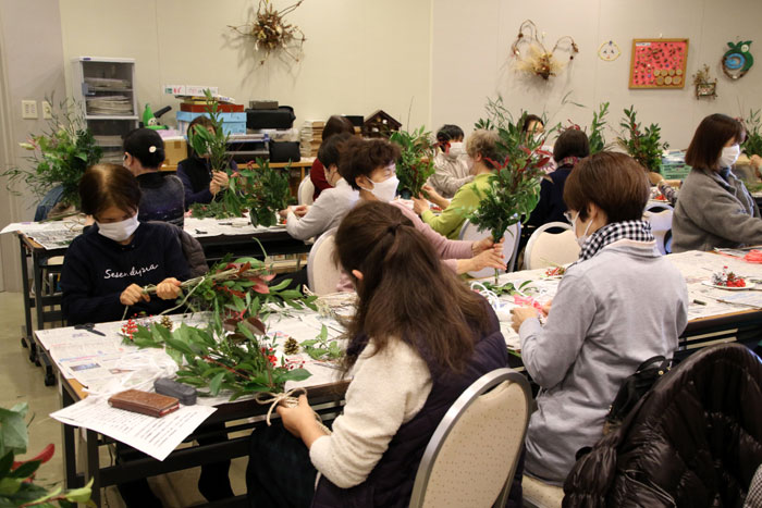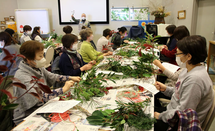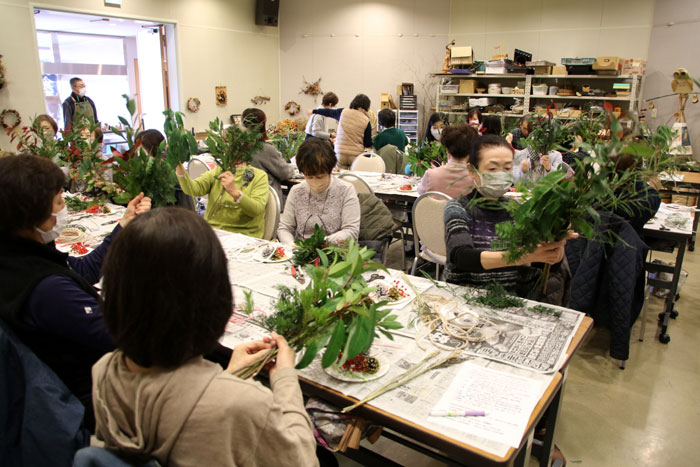 2025年12月20日(土)、「森の学校 めでたい正月飾りを作ろう!」が秋田県森林学習交流館・プラザクリプトンで開催された。参加者は25名。正月飾りは、めでたい意味のある材料で依り代を作り、年神様をお迎えするために飾る。飾る場所は、年神様が玄関から入ってこられるように、玄関先の軒下や玄関ドアに飾るのが一般的である。また、神棚や床の間など神様に滞在してほしい場所にも飾る。