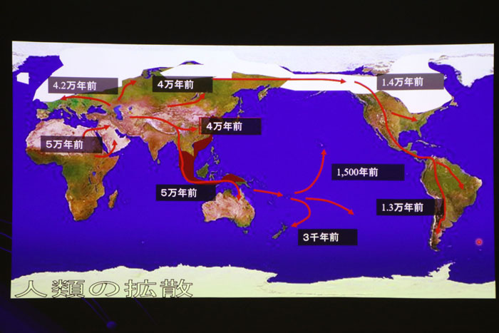 そして5万年前にアフリカから世界中に広がっていく。陸続きじゃないオーストラリアには、舟を使ってすぐに到達している。シベリアとアメリカ大陸は、1万4千年前、氷河期で海水面が低下し、陸続きとなっていたベーリング海を渡って北米大陸へ到達。その後、短期間で南米大陸の南端まで達した。