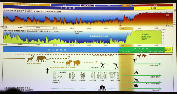 今よりもずっと寒い時代で、秋田県はシベリアのような環境だった。氷期になると海水面が下がる。2万5~7千年前、一番寒かった時代は、年間平均気温が7度ほど低く、海水面が140mほど下がる。北海道がサハリンと陸続で、日本海は大きな湖みたいな状態。だから日本海には暖かい対馬暖流が入って来ないので、雪雲が発生せず、秋田には雪がほとんど降らずに、大陸の寒気が直接入ってくる寒い時代だったと考えられている。そんな旧石器時代は、大陸から渡ってくるナウマンゾウやバイソンといった大型動物をハンティングして暮らしていた。