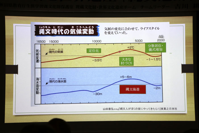 約1万年前に気候が安定化し、定住化で大きな村ができる。約5千年前になると気温が今よりも高くなってくる。三内丸山遺跡のような大きな村ができる。海水面は今よりも5mほど高くなる。これを「縄文海進」と呼んでいる。約4千年前から寒くなっていくと、大きな村から分かれて、数家族で村をつくるような「分散居住型」になる。縄文人は、気候が変わるとライフスタイルを変えていく。寒冷化すると生活がし難くなるので、儀式が増え、祭祀場=環状列石ができる。同時期、イギリスのストーンヘンジもできる。