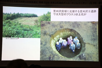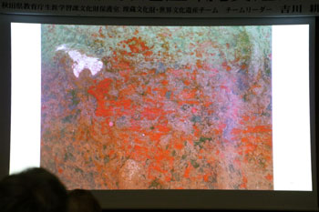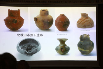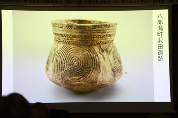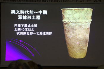 女性と男性の間にクマ、弓矢、落とし穴などの文様があり、何か縄文人の世界観を表しているのではないか。こうした文様は、北東北でしか見つかっていない。北東北に位置する北秋田市深渡遺跡でも似ている文様の土器が見つかっている。