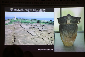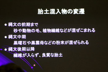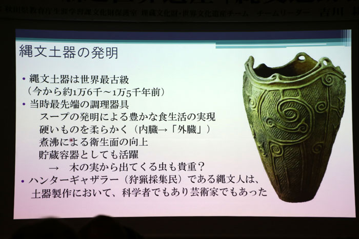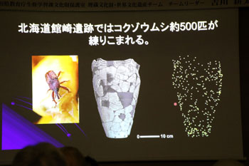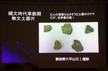 何とコクゾウムシ約500匹が練り込まれる土器が発見されている。何かお祈りのメッセージを込めたような呪術性を感じる土器である。縄文人の土器づくりは、実用性だけではなく、そこに祈りとか、縄文独特の世界観が込められている。それが何なのかは分からないが、少なくとも我々の物づくりとは違う価値観をもっている。自然に対する見方、自然との接し方、そうしたものがあったのではないか、といったことを考えていくのが大切なことではないか。 - 世界最古級の土器片/青森県大平山本Ⅰ遺跡