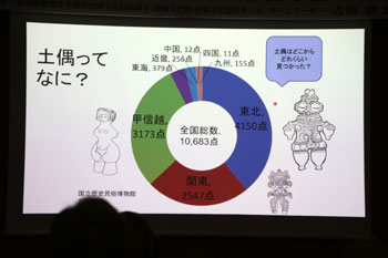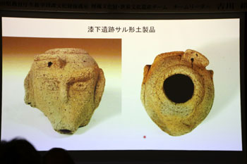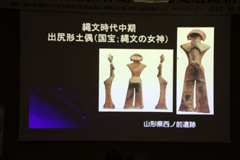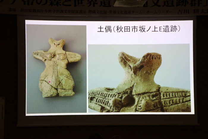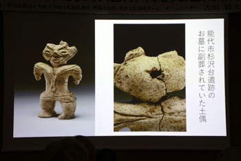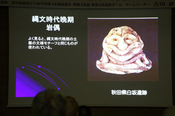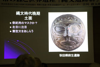 寒くなるような時代に土偶が多くなる。中でも東北地方が群を抜いて数が多い。その土偶のほとんどは女性だが、マタギの山の神様も女性であるように、何か精霊のようなものを表現しているのかもしれない。 - 縄文時代晩期の土面(麻生遺跡)・・・祭祀用にシャーマンみたいな人がつけるマスクではないかと考えられている。