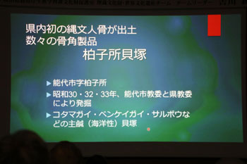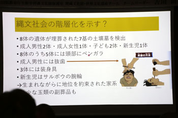 貝塚で県内初の縄文人骨が出土している。その人骨の腕にはまっていたのが貝輪で、腕輪として利用されていたことが分かる。この腕輪は、激しい労働をすれば壊れるので、そうした労働から解放された人ではないか。また埋葬された遺体の頭部にベンガラが塗られていたり、成人男性の抜歯、装身具、新生児にサルボウの腕輪があったりする。これは生まれながらに地位を約束された家系ではないか。つまり縄文の社会は、単純な平等社会ではなく、階層化していた可能性を示していると考えられている。