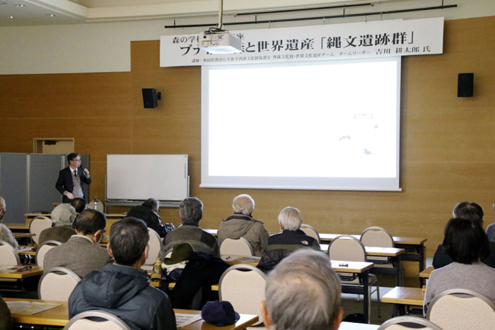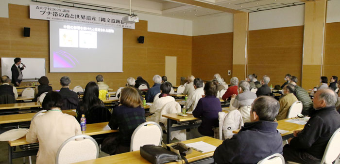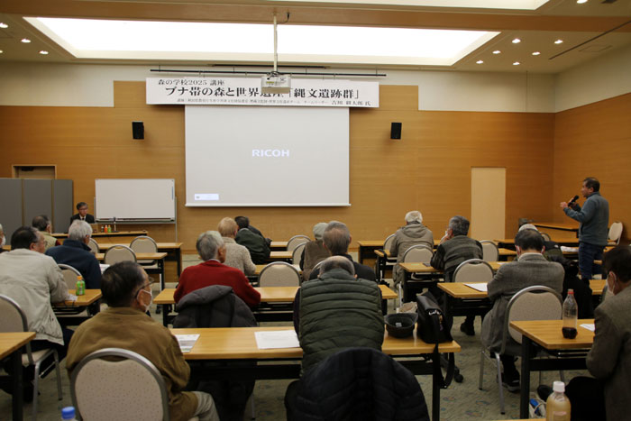 2026年1月24日(土)、森の学校2025講座「ブナ帯の森と世界遺産『縄文遺跡群』」が秋田県森林学習交流館・プラザクリプトンを会場に開催された。参加者は41名。講師の吉川耕太郎さんは、埋蔵文化財のスペシャリストだけに、1時間半でも全く足りないほど盛りだくさんのスライドを準備し、話の内容もこれ以上ないほど詳細に説明していただいた。ブナ帯に代表される北東北地方の豊かな自然の中で、1万年以上にもわたって続いた縄文文化のキーポイントの一つが、森の学校2022「元気ムラの旅シリーズ8 東成瀬村椿台探訪」で学んだ「大型磨製石斧」で、しかも「国宝級」の価値があるとの評価には、驚かされた。吉川さんの解説を聞くに従い、ブナ帯の森の中で生活していた縄文人にとって、木を伐るための道具「緑色の磨製石斧」がいかに重要な道具であったかを改めて知ることができた。その詳細は下記に記しているので、参加者は復習として、参加できなかった方、特に林業者の方にもじっくりご覧いただければ幸いである。