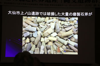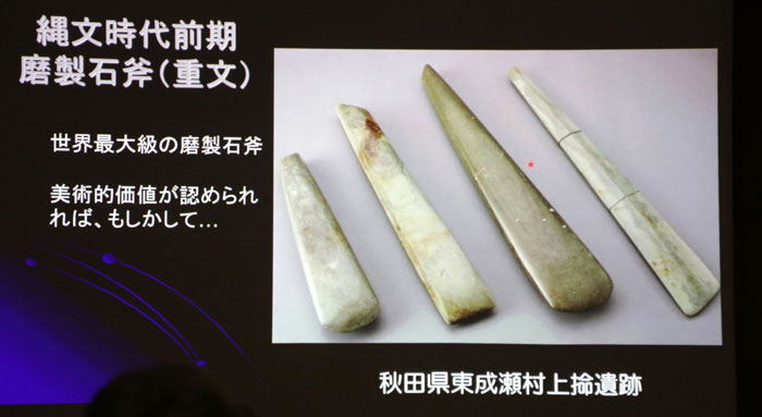 世界最大級の磨製石斧(ませいせきふ)で、今、国重要文化財に指定されているが、国宝になってほしいと思うほど大変貴重なものである。一番大きいもので長さが60cm、4.4kg。本来磨製石斧は、木を伐るための道具だが、ずば抜けて大きい。何かの儀式に使われたものであろう。6千年前、村の端っこに4本並べて埋土された状態で見つかった。刃先が集落の中心に向けられていた。その磨製石斧の石材は、400キロも離れた北海道の日高山脈でしか採れないアトラス石と鑑定された。北海道日高原産の磨製石斧は、北東北から北海道にかけて、広く分布している。