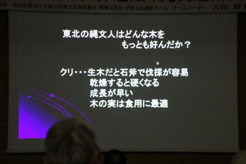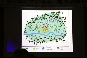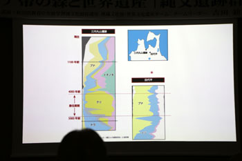 花粉は壊れにくい。5千年前の地層を発掘していると植物の花粉が検出される。その花粉から当時の植生を復元できる。近くの田代平のボーリング調査によると、最初はナラ林だが次第にブナ林帯になっている。ところが同時期の三内丸山遺跡では、最初はナラ林が多いが、人が住み始めると急にクリが多くなる。また人が住まなくなるとナラ林に戻り、次第にブナ林になっている。