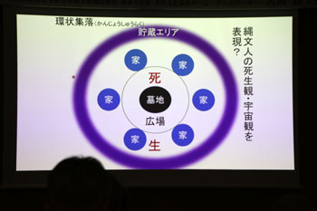 森を伐り開いて、まず広場をつくり、その周りに竪穴住居を囲むようにつくり、谷を挟んだ向こう側に木の実の貯蔵エリアをつくり、広場の真ん中に墓地をつくる。これが縄文時代の典型的な村の構造で、環状集落と呼んでいる。中心に死の世界があって、その周りに生の世界が取り囲むような縄文人の死生観、世界観は、墓地と住居を分けるような我々の町づくりとは全く異なっている。