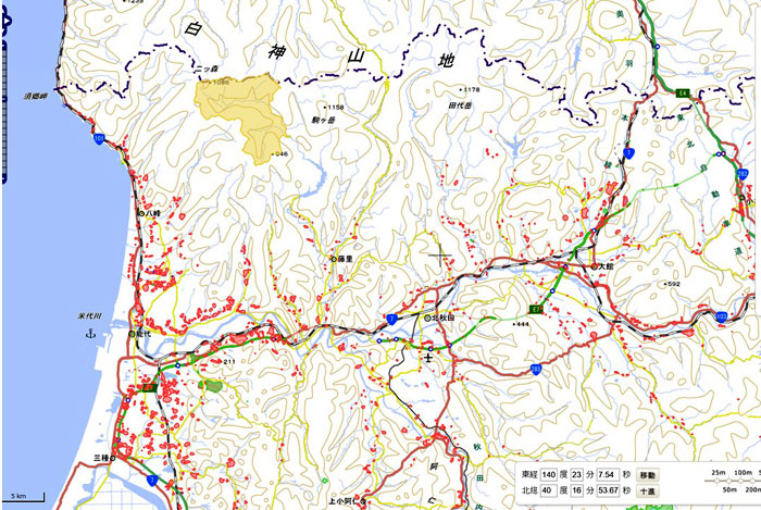 県内の遺跡地図情報には、恵み豊かなブナ帯の代表である白神山地には、遺跡が発見されていない空白域となっている。それは何故か・・・白神山地は、世界自然遺産になるほど開発されていないので、遺跡発掘調査がほとんど行われていないからである。高速道路とか新幹線沿いに遺跡が多いのは、開発に伴って、それだけ多くの遺跡発掘調査を行っているからである。そこが遺跡地図を見る際に注意が必要な点である。