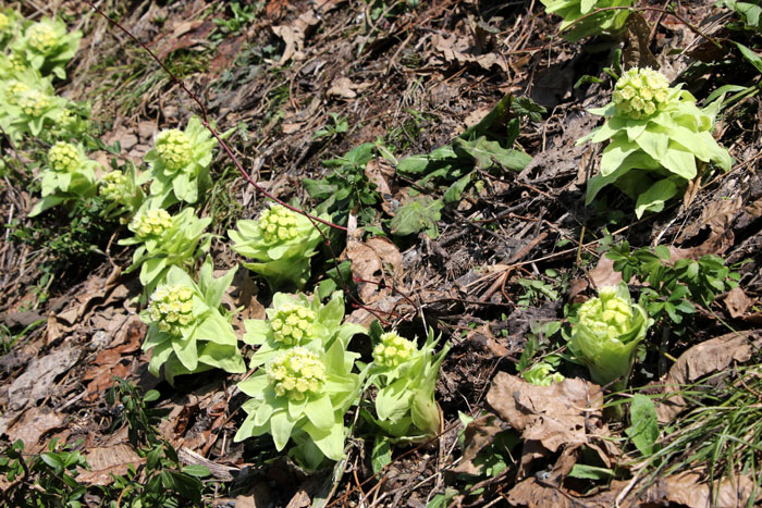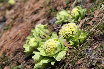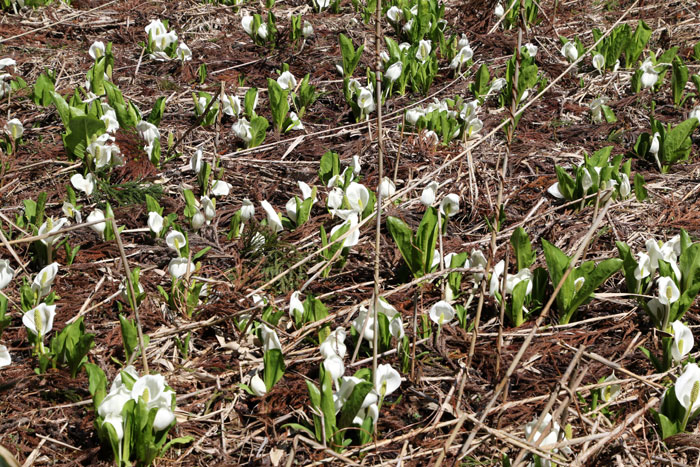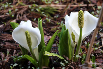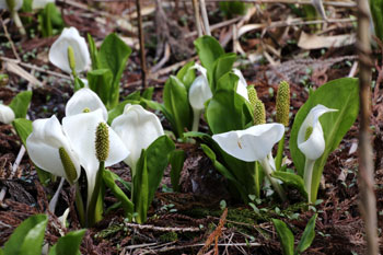 - 雪解け水がもたらす花・ミズバショウ・・・葉は花後にビックリするほど大きくなるが、この葉はツキノワグマの大好物である。