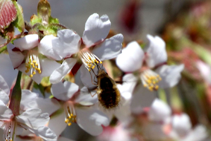 - オクチョウジザクラの花蜜を吸うビロードツリアブ(樹木見本園)