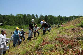 - 植樹会場一面に散らばり植樹を開始する。今年は、ミズキ・ブナ・ケヤキ・ヤマモミジの4樹種を400本準備した。植樹に参加した人々は総勢300人、一人1本を目安に植えた。