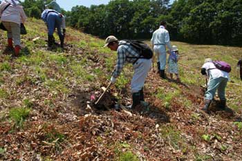 - 森づくり活動・・・式典終了後、森づくり活動の会場である東山森林公園にバスで移動する。植樹活動が始まった午前11時には、気温が30℃近くと暑くなった。今回の植樹場所は、公園に入って直ぐのなだらかな丘の斜面が中心だ。