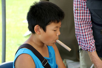 - 子どもたちに大人気だったヤマメ・ガラ掛け釣り(雄勝漁協)・・・準備したヤマメは100匹。全て釣られ完売したという。ヤマメ(山女魚)は、「渓流の女王」と呼ばれ、「渓流の王者・イワナ」と並んで渓流釣り愛好家に人気の高い魚である。思えば、実写版映画「釣りキチ三平」の鮎釣り大会は、神室山、虎毛山に源を発する湯沢市秋の宮の清流・役内川で行われた。こうした清流の魚釣りを通して、森と川に興味をもってくれれば嬉しい。