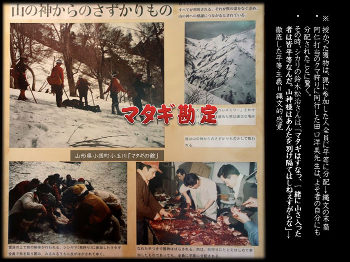 「マタギはすなっ、一緒に山さ入った者は皆平等なんだ。山神様はあんたを別け隔てはしねぇすがらな」・・・この徹底した平等主義こそ、縄文・蝦夷を基層とする狩猟文化らしいところである。