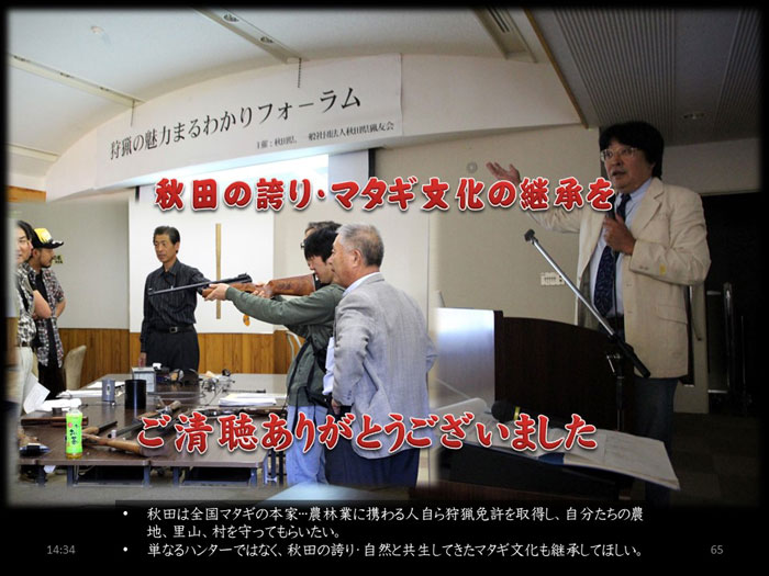 - 秋田は全国マタギの本家。まずは農林業に携わる人自ら狩猟免許を取得し、自分たちの農地、里山、村を守ってもらいたい。その際、単なるハンターではなく、秋田の誇り「自然と共生してきたマタギ文化」も継承していただきたい。
